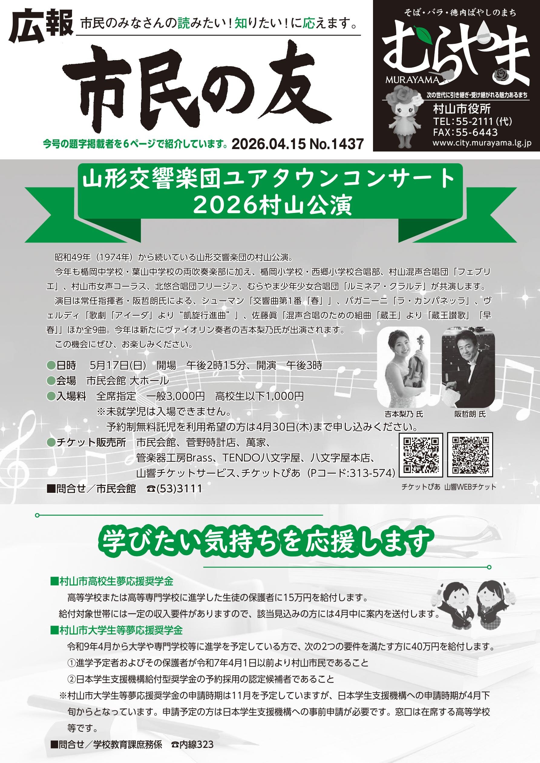 ◎山形交響楽団ユアタウンコンサート2026村山公演 ◎学びたい気持ちを応援します ◎教育長就任あいさつ、退任あいさつ ◎むらやまお ...