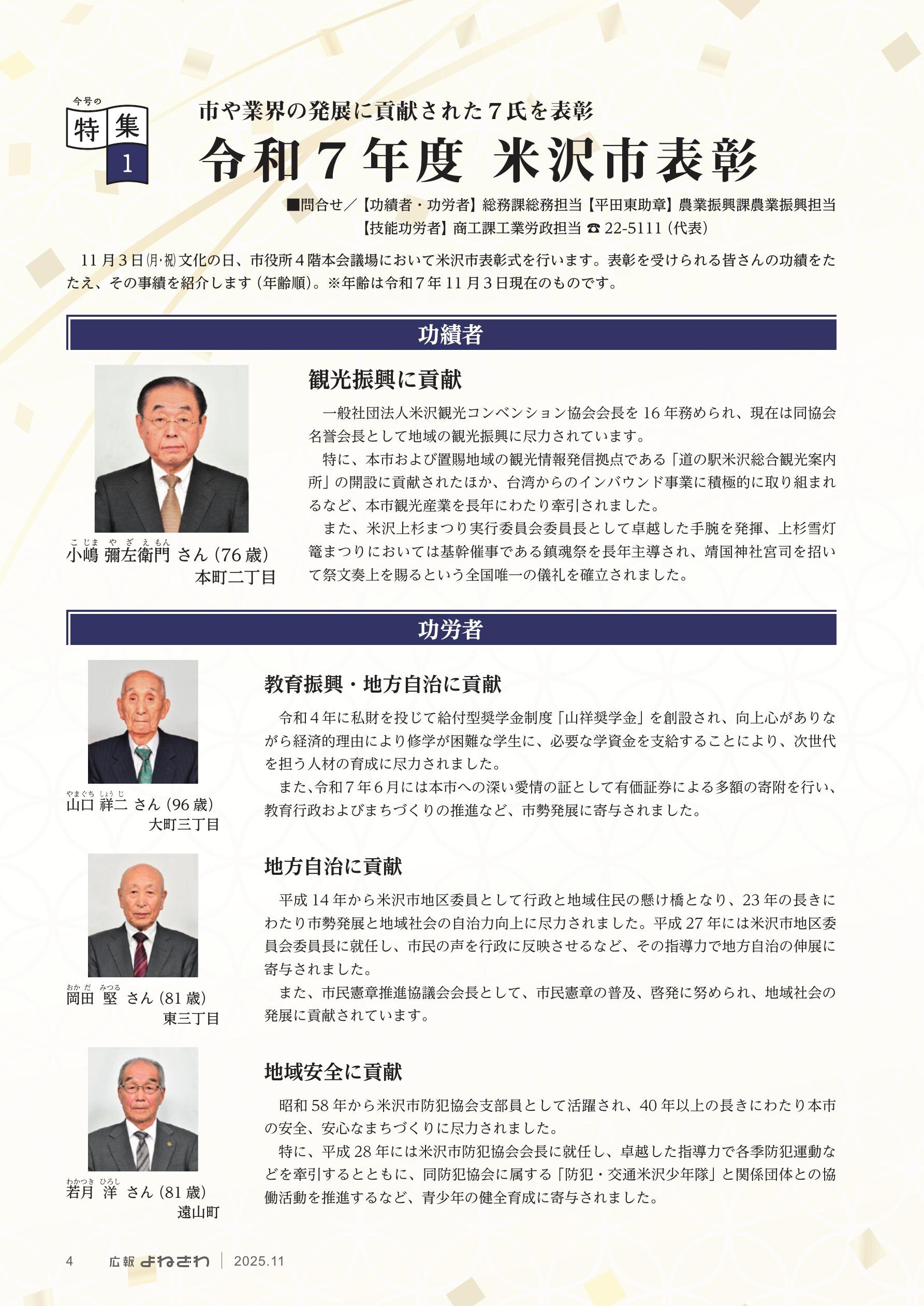◎特集1 令和7年度 米沢市表彰